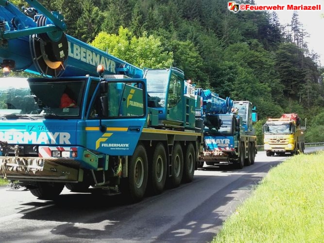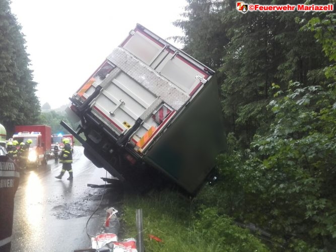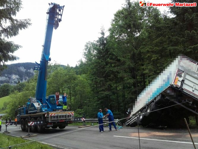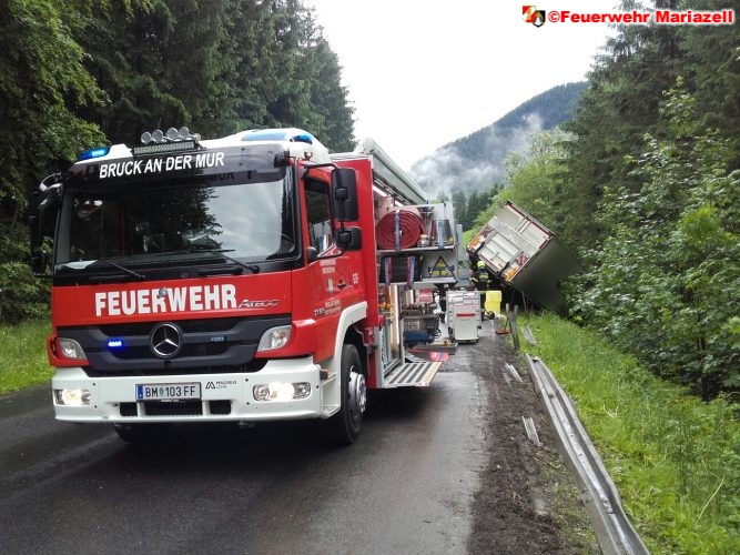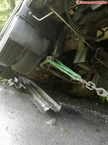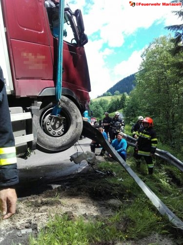 Die Feuerwehren Gußwerk und Mariazell wurden am 10. Juni 2017 um 05.27 Uhr früh durch Florian Steiermark zu einer LKW-Bergung auf der B20 in Fallenstein alarmiert. Sehr bald stellte sich für die Einsatzkräfte heraus, dass der Einsatz komplex und lange andauernd sein wird. Ein etwa 26 Tonnen wiegender LKW war aus unbekannter Ursache von der Fahrbahn abgekommen, hatte die Leitschiene über fast 50 Meter unter das Fahrzeug bekommen und hängte dann exakt am Kipppunkt des Fahrzeuges auf der steilen Böschung. Zudem war der Treibstofftank mit etwa 800 Liter Dieselöl leck geworden. Zum Glück war der Fahrer des Kühlwagens mit Lebensmittel unverletzt.
