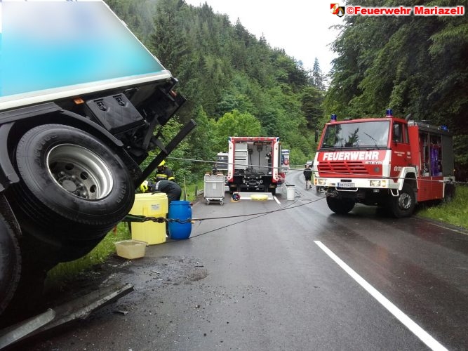 Sofort wurde der LKW mit SRF-Seilwinde und Greifzug gegen das Umkippen gesichert und der auslaufende Treibstoff so gut wie möglich aufgefangen. Für das Umpumpen des Treibstoffes wurde umgehend das Gefährliche Stoffe Fahrzeug der FF Bruck / Mur und der Ölschadenscontainer der FF Mariazell nachgefordert. Eine stundenlange Totalsperre der B 20 war ebenso nötig.
