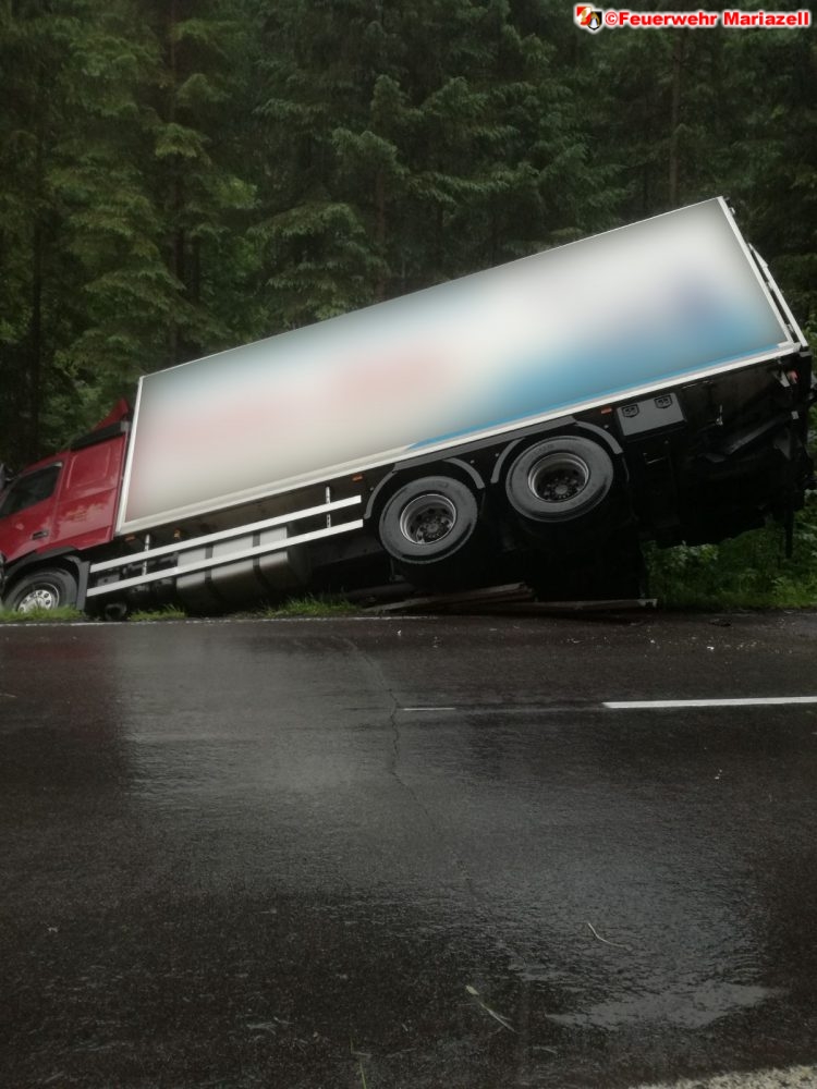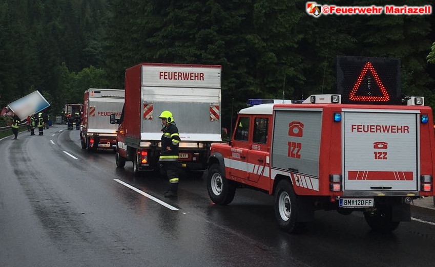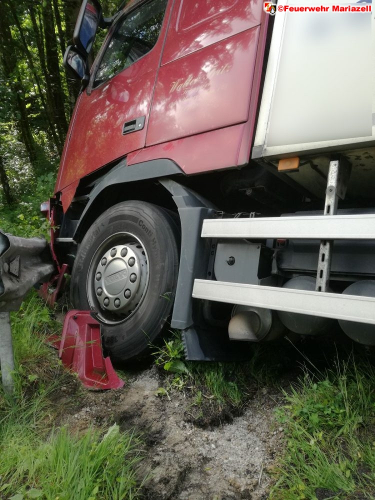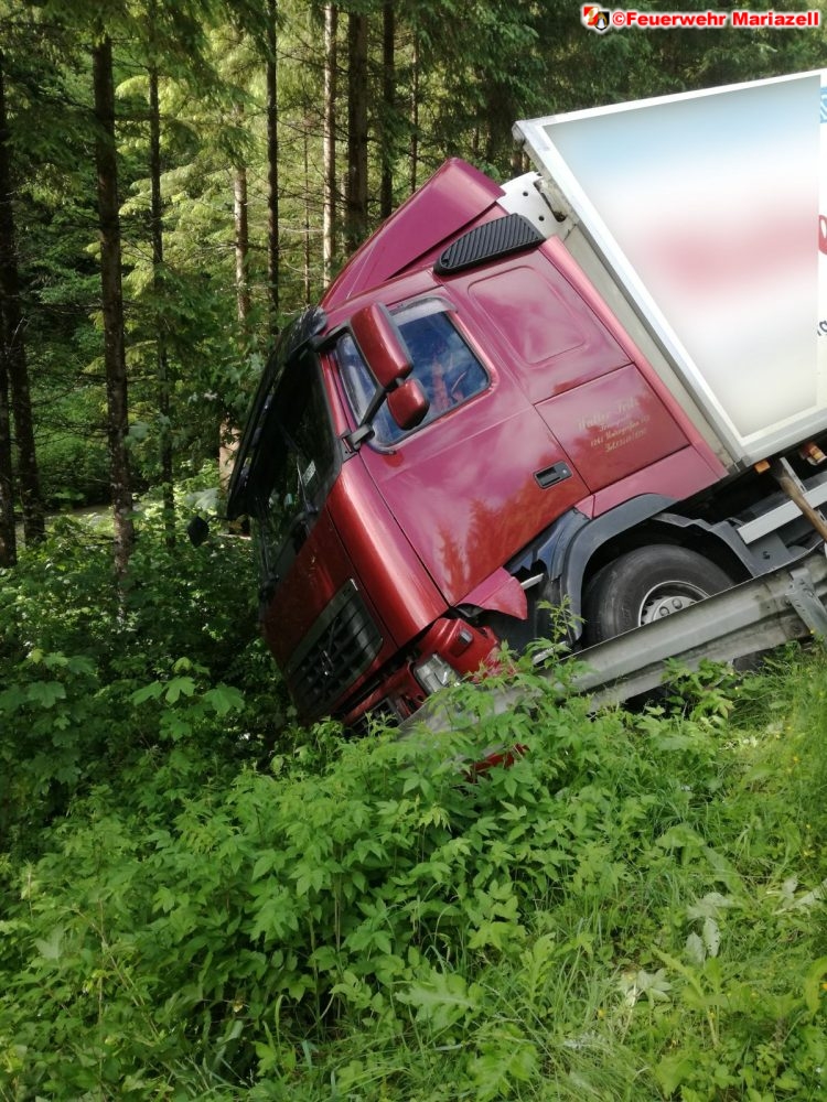 Die Feuerwehren Gußwerk und Mariazell wurden am 10. Juni 2017 um 05.27 Uhr früh durch Florian Steiermark zu einer LKW-Bergung auf der B20 in Fallenstein alarmiert. Sehr bald stellte sich für die Einsatzkräfte heraus, dass der Einsatz komplex und lange andauernd sein wird. Ein etwa 26 Tonnen wiegender LKW war aus unbekannter Ursache von der Fahrbahn abgekommen, hatte die Leitschiene über fast 50 Meter unter das Fahrzeug bekommen und hängte dann exakt am Kipppunkt des Fahrzeuges auf der steilen Böschung. Zudem war der Treibstofftank mit etwa 800 Liter Dieselöl leck geworden. Zum Glück war der Fahrer des Kühlwagens mit Lebensmittel unverletzt.