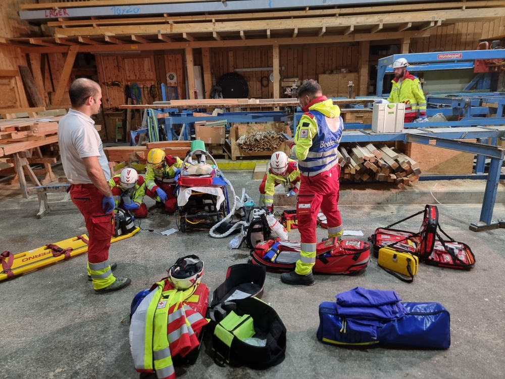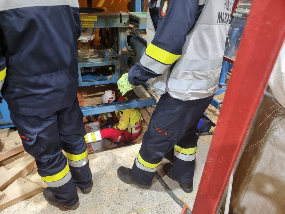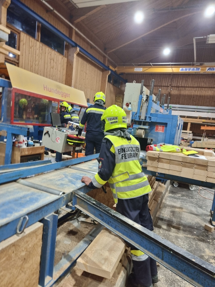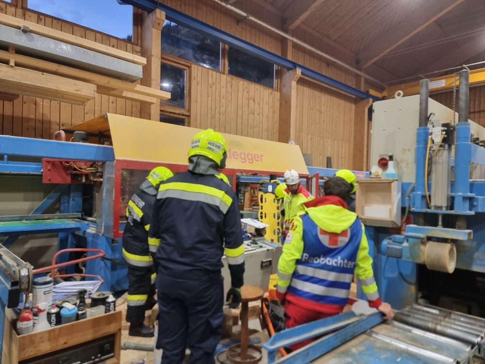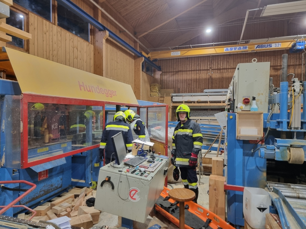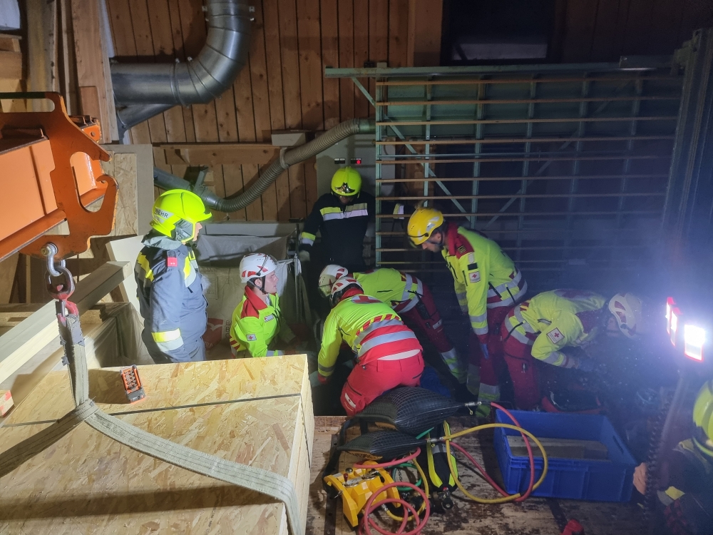 Die Übungsannahme: Nach einem Stromausfall kam es in der Sägehalle des Betriebs zu einem schweren Arbeitsunfall. Mehrere Personen wurden dabei verletzt. Zwei Betroffene mussten aus der Halle gerettet werden, eine weitere Person befand sich im angrenzenden Silo.