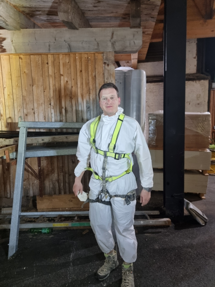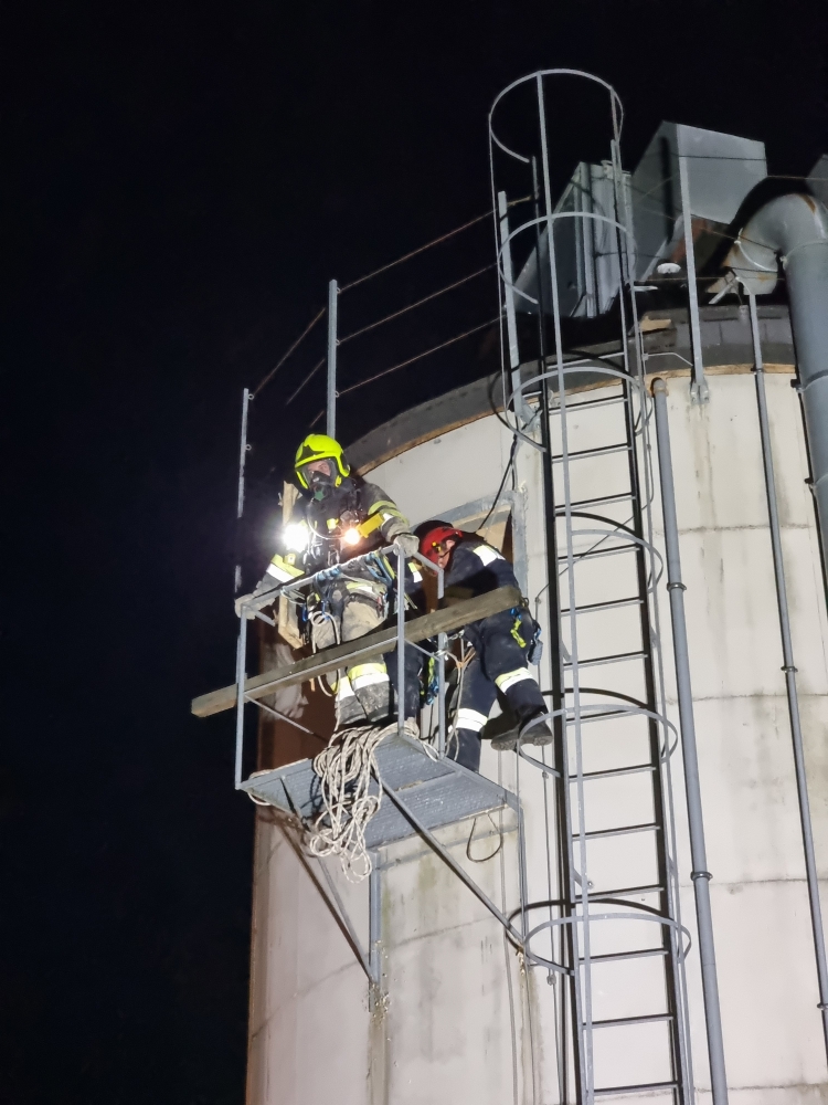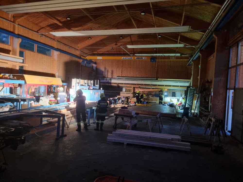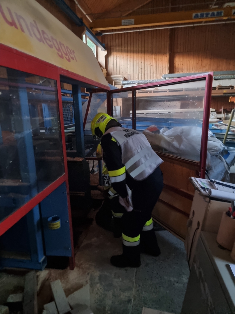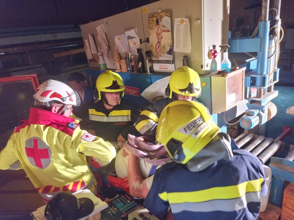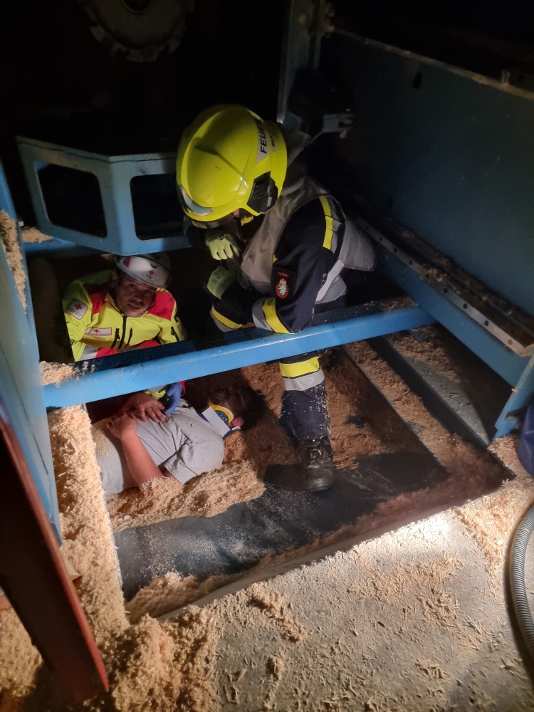 Die Übungsannahme: Nach einem Stromausfall kam es in der Sägehalle des Betriebs zu einem schweren Arbeitsunfall. Mehrere Personen wurden dabei verletzt. Zwei Betroffene mussten aus der Halle gerettet werden, eine weitere Person befand sich im angrenzenden Silo.