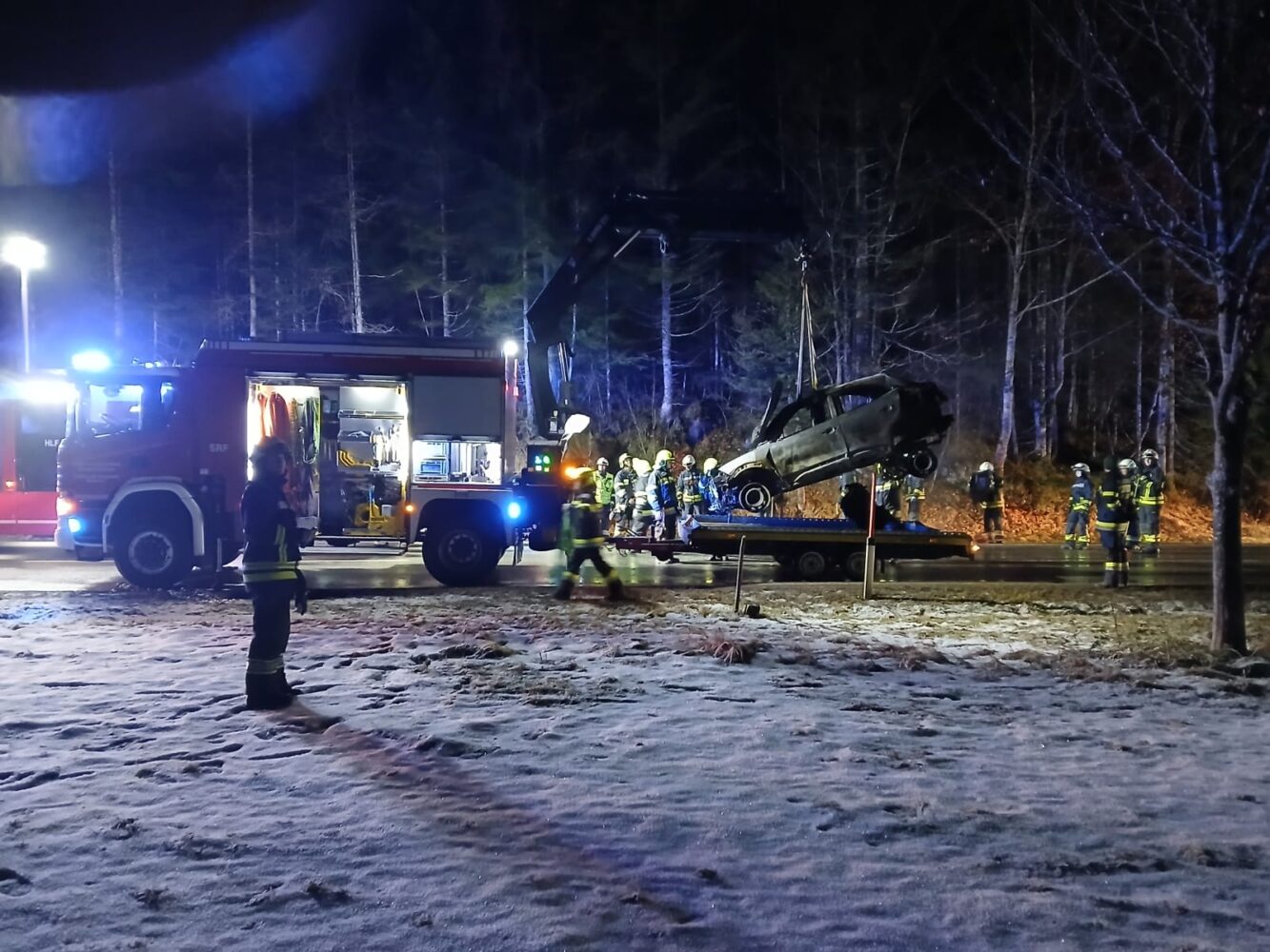 Kurze Einsatzschilderung:Aus bislang unbekannter Ursache geriet ein Pkw auf der B71 Zellerrain Straße in Vollbrand. Personen wurden zum Glück nicht verletzt. Nach den Löscharbeiten wurde der Pkw mit dem SRF Hebekran auf den Transportanhänger verladen, gesichert und abtransportiert.