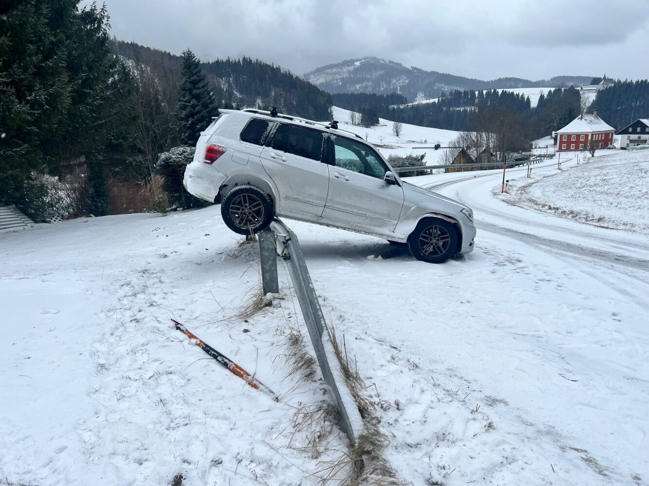 Gegen 9.30 Uhr wurden zunächst die Feuerwehren Wienerbruck und Annaberg zu dem Verkehrsunfall kurz nach der Kreuzung der B 28 mit der B 20 alarmiert. Ein vom „Wastl“ talwärts fahrendes Fahrzeug verlor auf der winterlichen Fahrbahn die Kontrolle, rutschte seitlich auf die Leitschiene und blieb dort hängen.