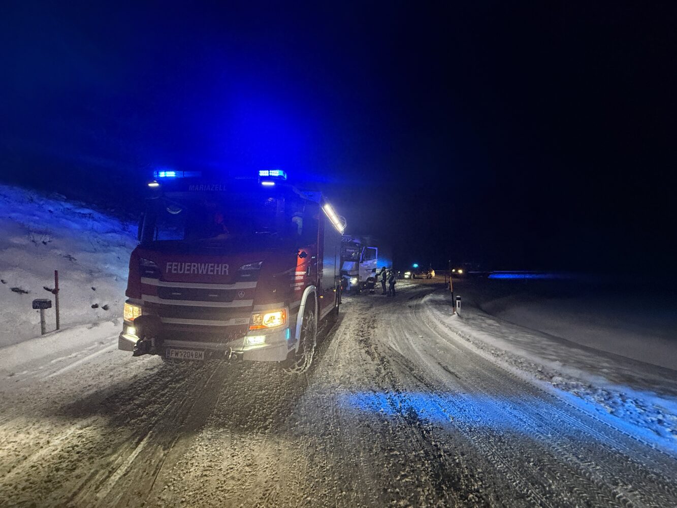 Am Montag, dem 12. Jänner, mussten unsere Einsatzkräfte gleich zweimal zu LKW-Bergungen ausrücken. Aufgrund der winterlichen Fahrbahnverhältnisse sowie unzureichender Winterausrüstung blieben zwei Sattelzüge auf den Verkehrswegen der B71 und der B21 hängen und blockierten die Fahrbahn.